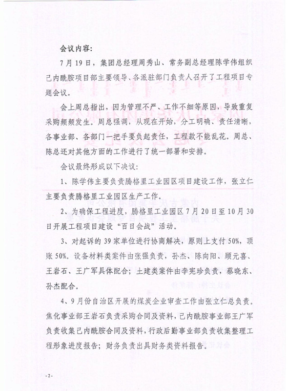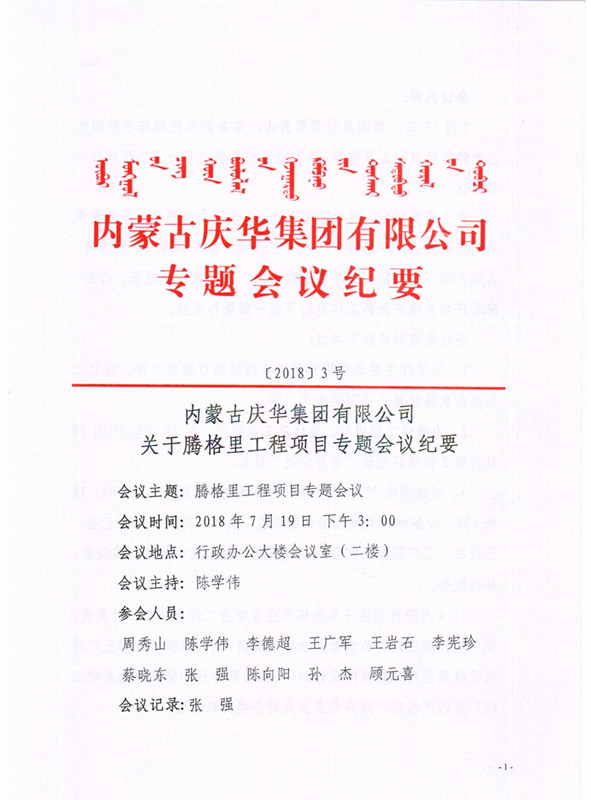 內蒙古慶華集團有限公司關于騰格里工程項目專題會議紀要